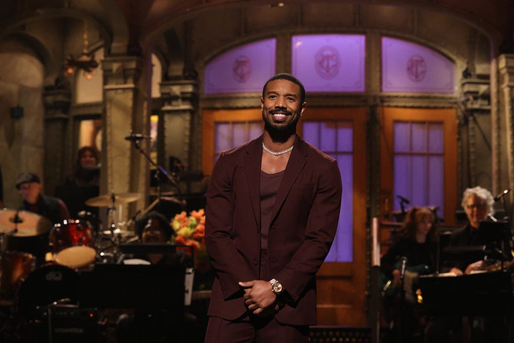 Stupid, sexy Michael B. Jordan. Having to be a jacked action star for Black Panther and the Creed movies and being a great SNL host. The show capitalized on Jordan’s sex appeal, pairing him up with a string of female castmembers during his monologue and having him play a stripper toward the end of the episode.