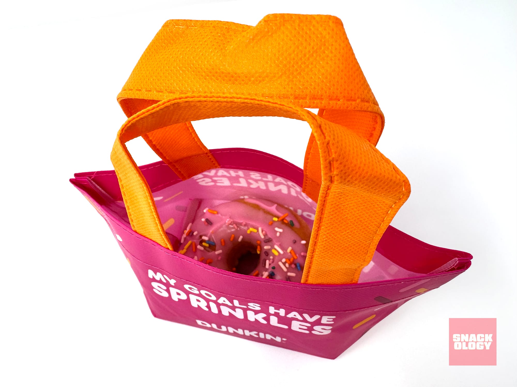 The best part of Dunkin’s reusable donut bag? My strawberry frosted donut was — finally! — not plopped frosting side down into the bag.