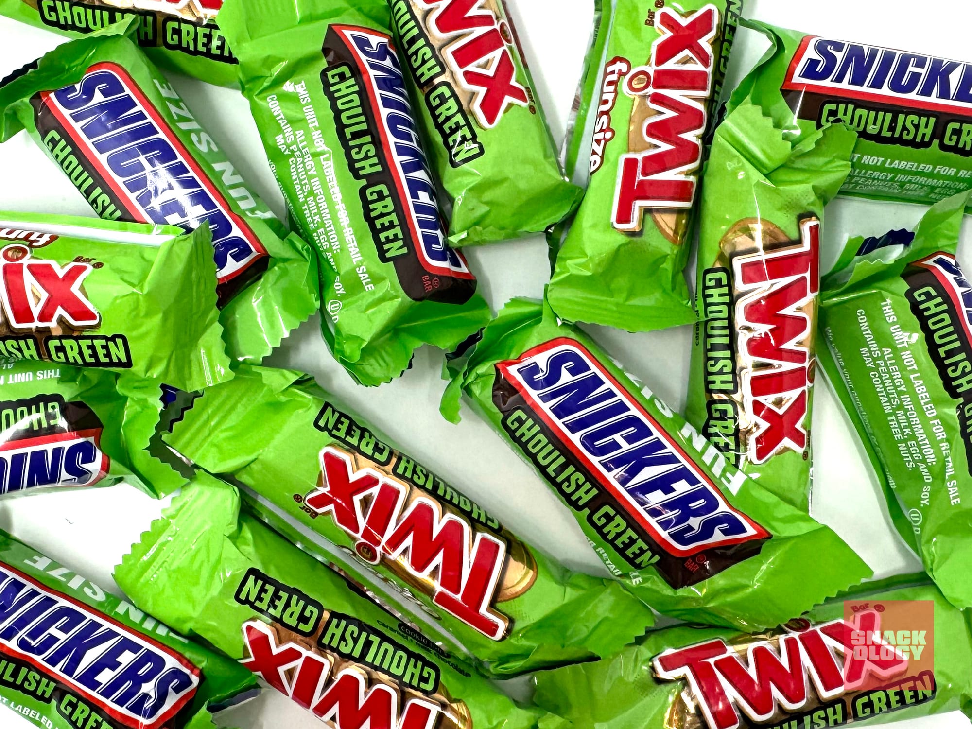 My thoughts: Waitaminute, is Dubai chocolate just a twist on Ghoulish Green filling but for people who’ll spend fifteen bucks on a candy bar? I asked myself as I was taking bites of these Halloween-themed Twix and Snickers bars.