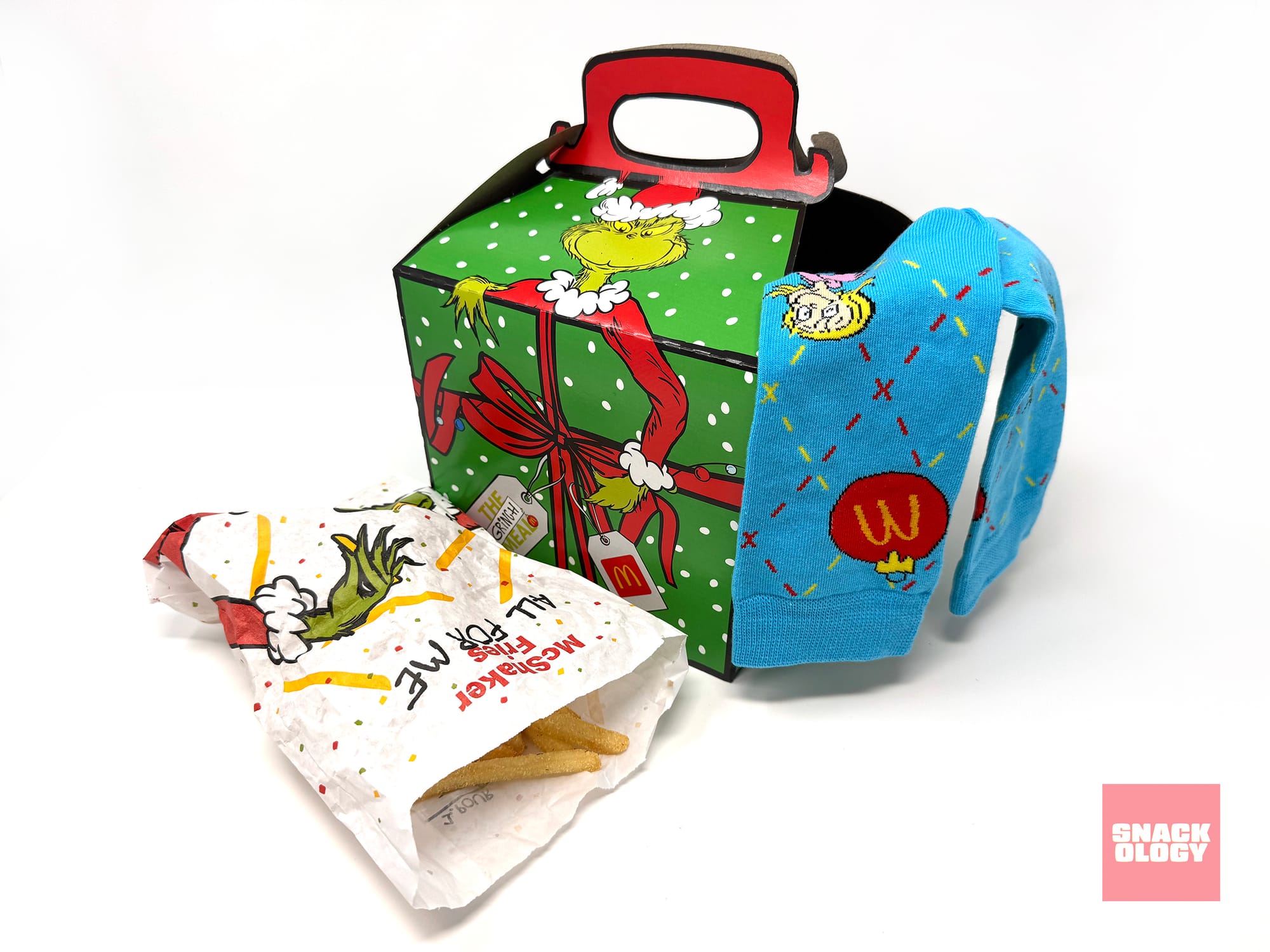 The Grinch Meal is the latest installment in McDonald’s line of “let’s not call them Happy Meals since they’re targeted at adults” promotions, following in the footsteps of The McDonaldland Meal and A Minecraft Movie Meal. The highlight of The Grinch Meal absolutely has to be the Dill Pickle McShaker Fries, featuring “Grinch Salt.” There are also four different sock designs that you can get with this meal.