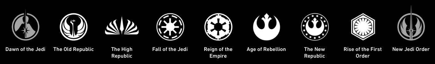 A quick and fun bit of Star Wars lore keeping: The official site updated recently to include the nine major eras of Star Wars storytelling, listing which movies and TV shows fall under each of the era.