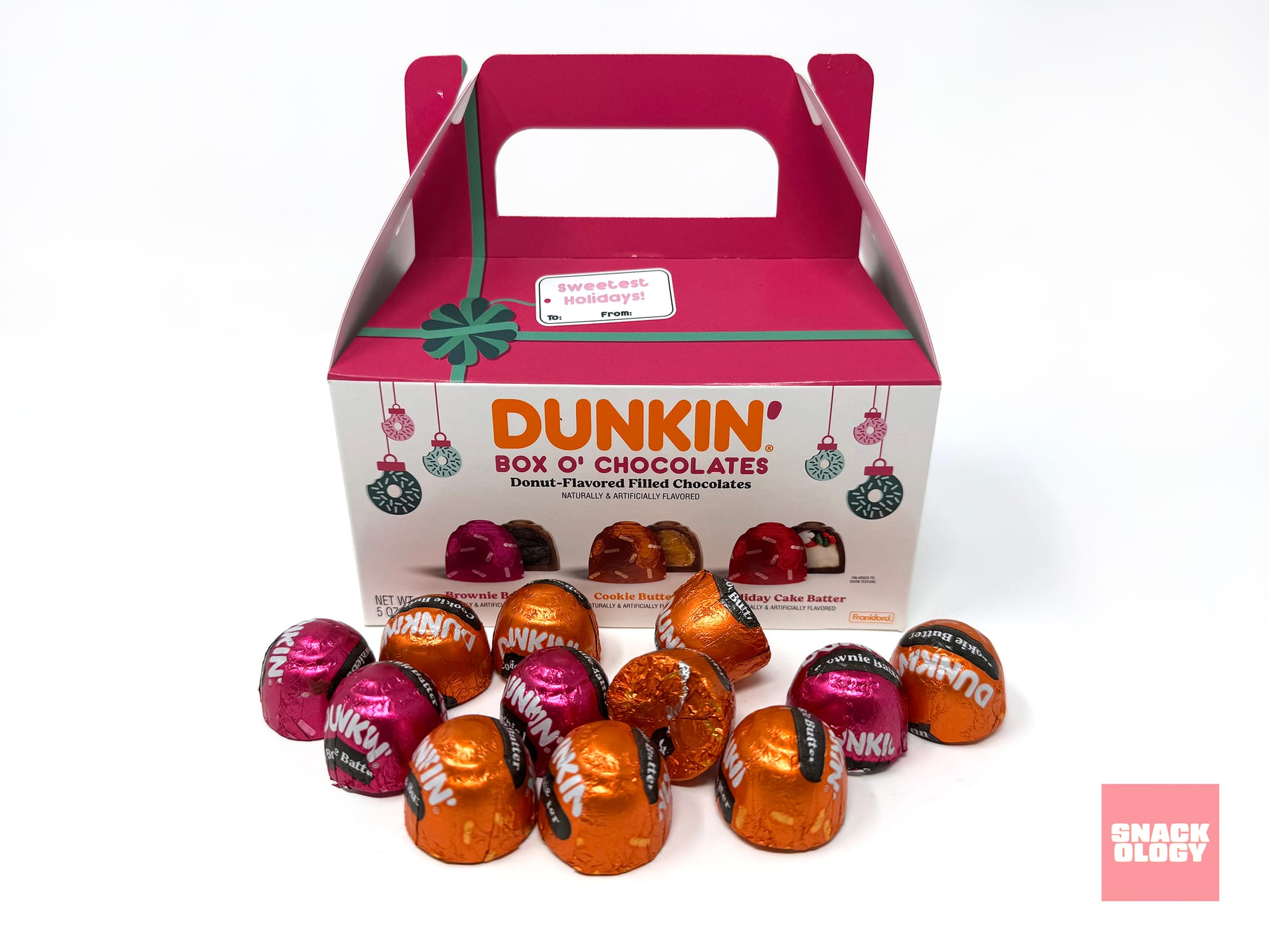 My thoughts: Ah, the Dunkin Box O’ Chocolates. I tried to hunt this one down last Christmas, but I came up short, so I didn’t hesitate to toss it into my cart when I spotted it at Target. The 2025 version of the Box O’ Chocolates is supposed to include chocolates filled with Brownie Batter, Cookie Butter and Holiday Cake Batter.