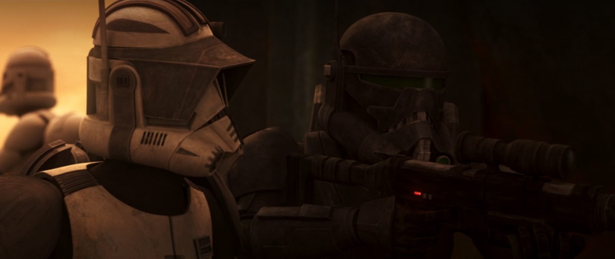 “Didn’t recognize you,” Crosshair quipped to Cody. Like much of the galaxy under Imperial rule, the color has been drained from Cody’s once-orange armor.