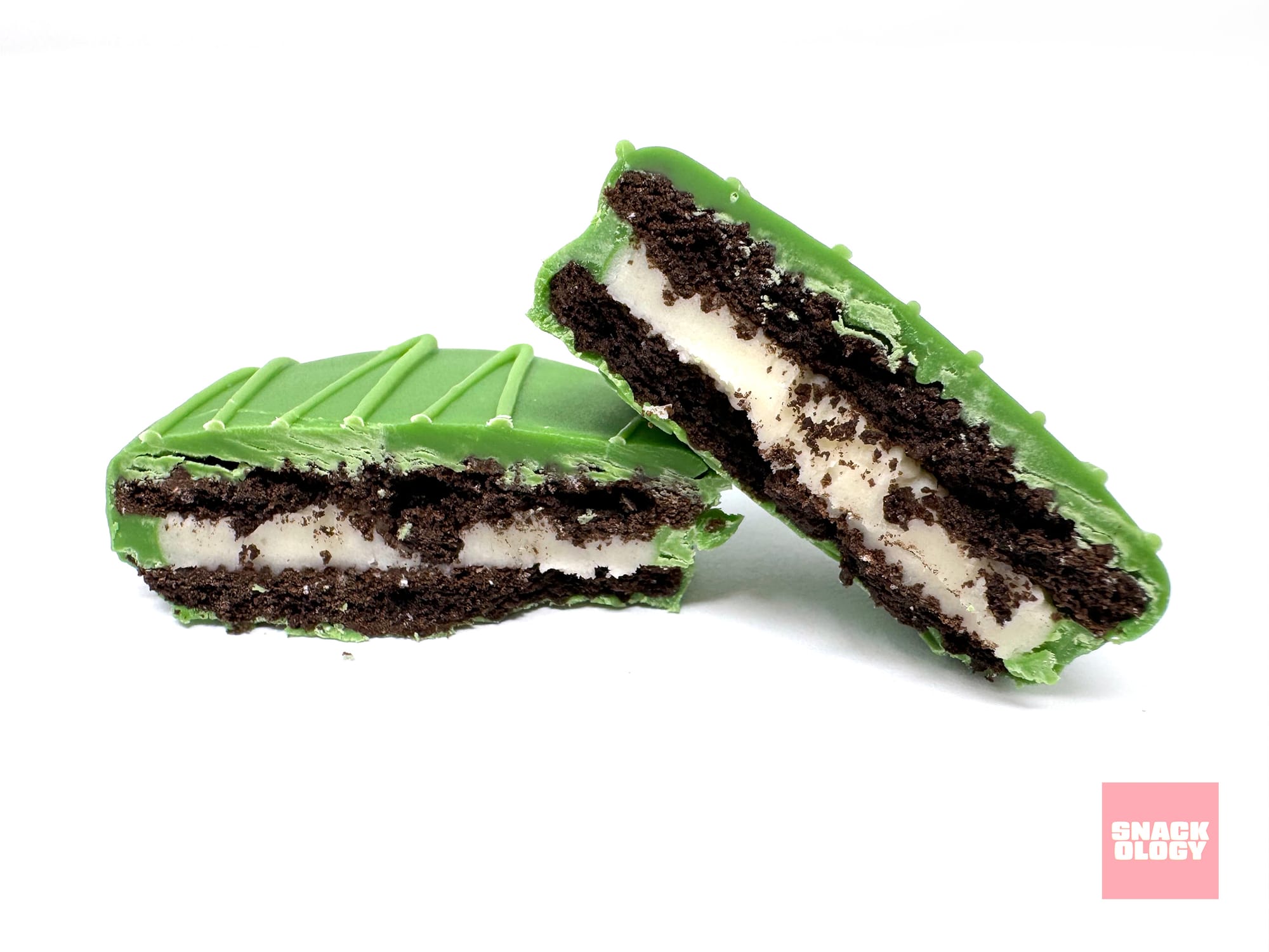 Inside that pickle-y exterior was a perfectly normal chocolate Oreo. Based on the cross section, I’m pretty sure they’re standard Oreos and not Double Stuf ones.