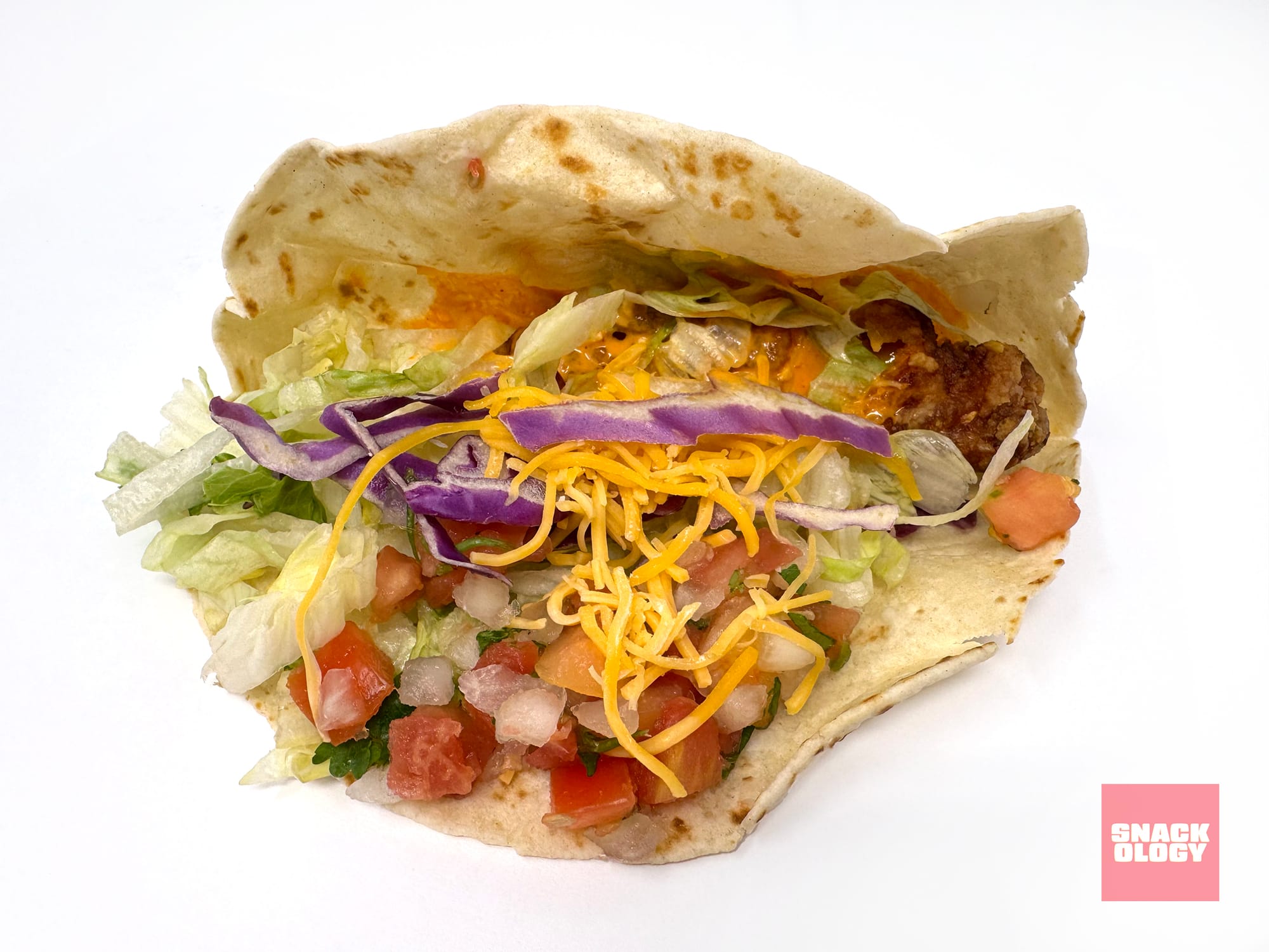 The Frank’s RedHot Diablo Crispy Chicken Soft Taco is the exact same thing you get in the burrito but in a soft taco instead. Unlike the burrito, the proportions of this taco are off. The single chicken strip sits at the bottom while a mountain of lettuce, cabbage, cheese and pico fill up the rest of the soft tortilla.