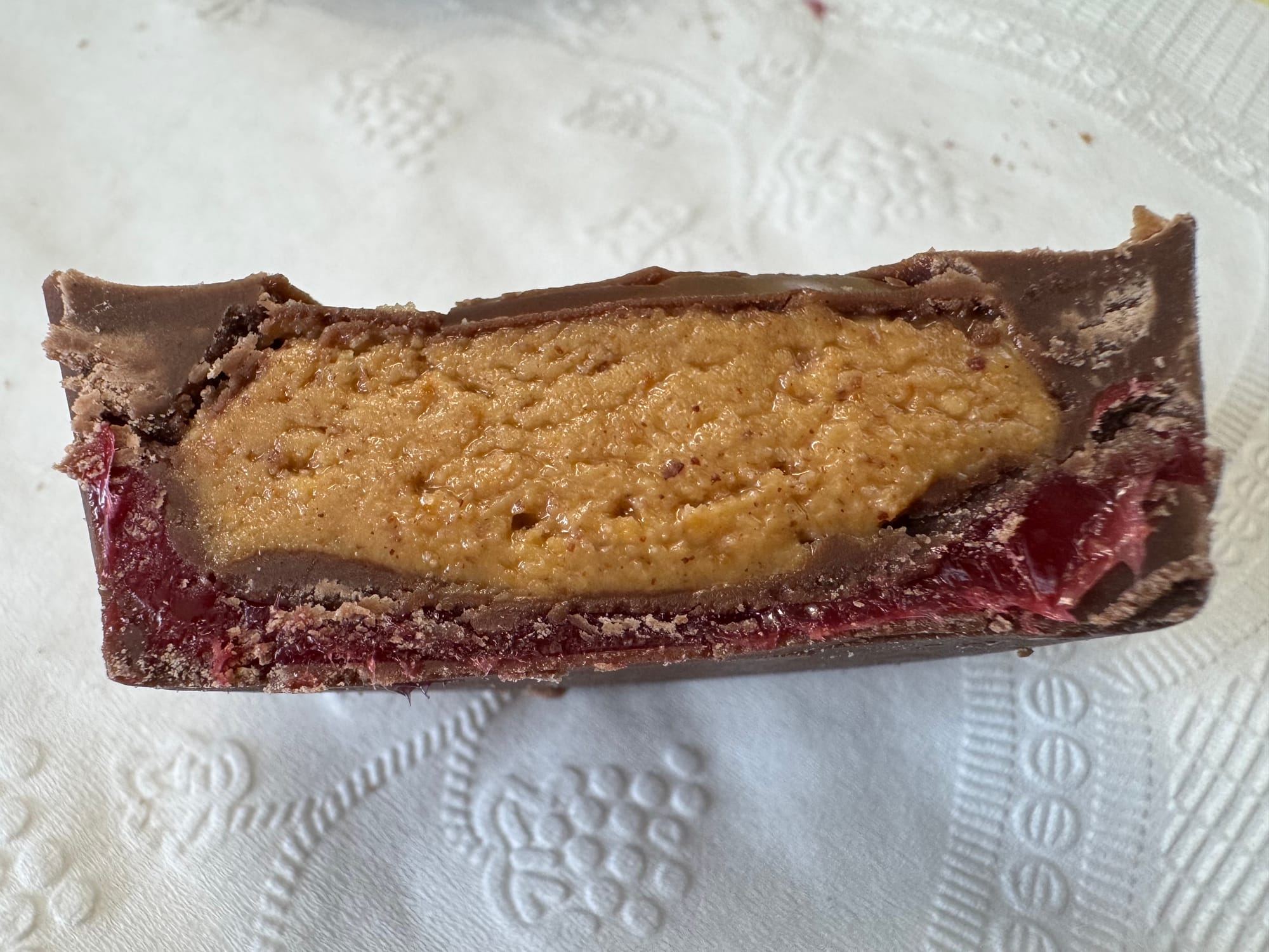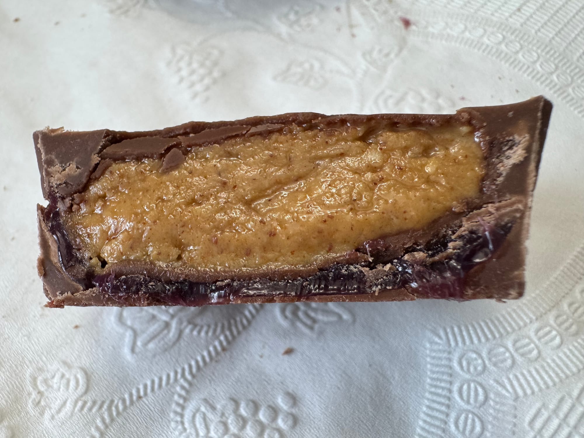Let's dive into the science of a Reese’s PB&J Big Cup. You’ll note in the cross section above (take that, Binging With Babish), these fellas are still 99 percent peanut butter. The jelly — sorry, grape flavored filling — is a thin layer between the Big Cup’s peanut butter core and the bottom of its chocolate shell.